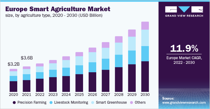 Key technologies driving the market demand include livestock biometrics, such as RFID, biometrics, and GPS to help cultivators automatically obtain information regarding livestock in real-time. Furthermore, infrastructural health sensors are used for monitoring material conditions and vibrations in buildings, factories, bridges, farms, and other infrastructure. Coupled with an intelligent network, infrastructural health sensors help provide information to the maintenance team in real-time. In addition, agricultural robots are being used to automate farming processes, such as soil maintenance, weeding, fruit picking, harvesting, planting, plowing, and irrigation, among others.