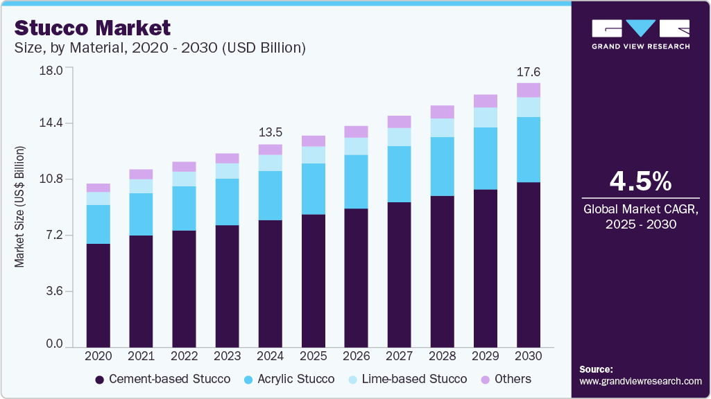 The global stucco market size was valued at USD 13.55 billion in 2024 and is projected to reach USD 17.65 billion by 2030, growing at a CAGR of 4.5% from 2025 to 2030. This growth is fueled by rising demand across residential and commercial construction projects. Stucco, known for its versatility and durability, serves both decorative and functional purposes, offering an appealing exterior finish while providing structural protection.